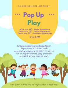 Join us for our next indoor drop-in Pop-Up Play Event. This is an opportunity for Sooke children entering Kindergarten, in Fall 2026, to join a Kindergarten play time in a school gym. Please come to any school, not just your future school. Come meet other children entering Kindergarten as well as current Kindergarten students, teachers, and staff.